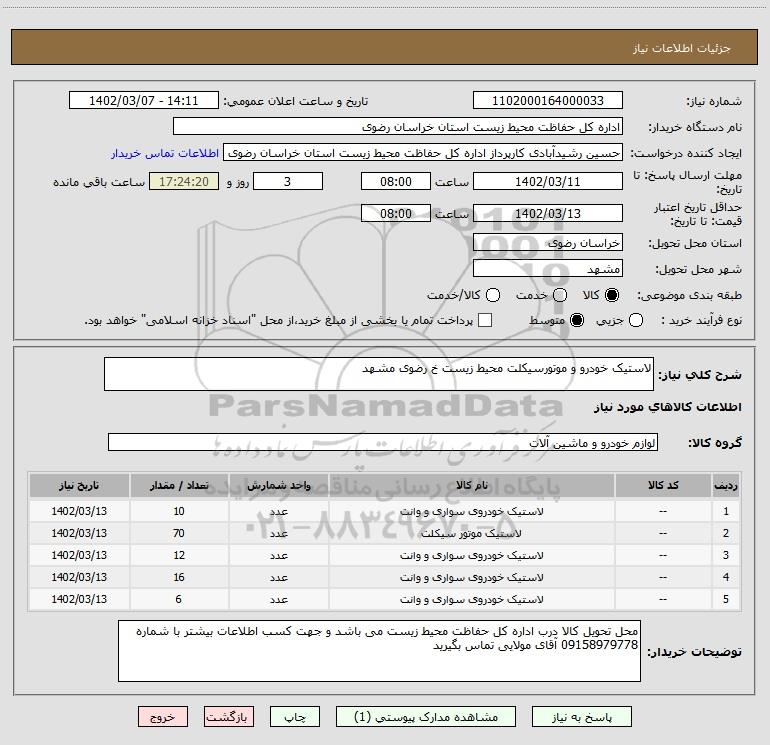 شرح کلی نیاز: لاستیک خودرو و موتورسیکلت محیط زیست خ رضوی مشهد