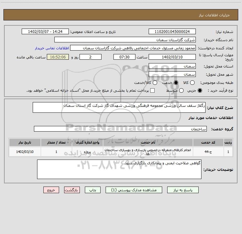 شرح کلی نیاز: رگلاژ سقف سالن ورزشی مجموعه فرهنگی ورزشی شهدای گاز شرکت گاز استان سمنان