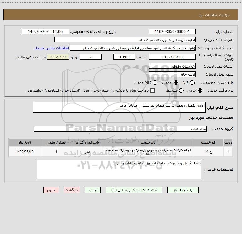 شرح کلی نیاز: ادامه تکمیل وتعمیرات ساختمان بهزیستی خیابان جامی