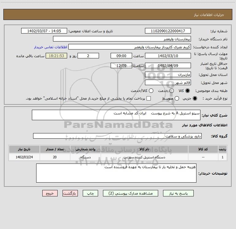 شرح کلی نیاز: سپتو استریل A به شرح پیوست ایران کد مشابه است