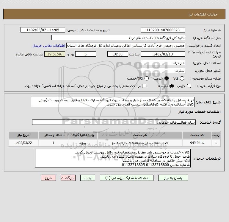 شرح کلی نیاز: تهیه وسایل و لوله کشی فضای سبز بلوار و میدان بیرون فرودگاه ساری دقیقا مطابق لیست پیوست (برش کاری آسفالت و ..)کلیه کارهامطابق لیست انجام می شود.