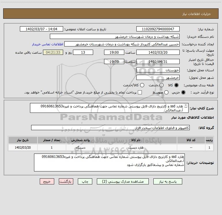 شرح کلی نیاز: هارد ssd و کارتریج دارای فایل پیوستی شماره تماس جهت هماهنگی پرداخت و غیره09160613653 آ.عبدالمالکی