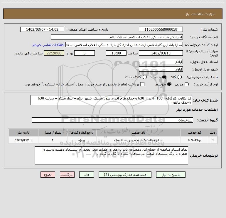 شرح کلی نیاز:  نظارت کارگاهی 180 واحد از 630 واحدی طرح اقدام ملی مسکن شهر ایلام – بلوار میلاد – سایت 630 واحدی ماهور