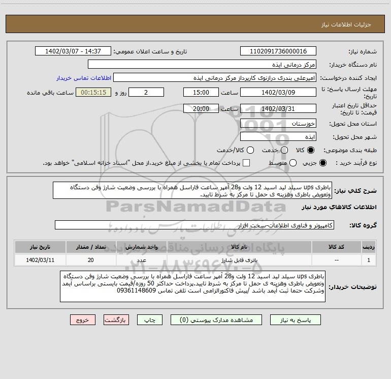 شرح کلی نیاز: باطری ups سیلد لید اسید 12 ولت و28 آمپر ساعت فاراسل همراه با بررسی وضعیت شارژ وفن دستگاه وتعویض باطری وهزینه ی حمل تا مرکز به شرط تایید.