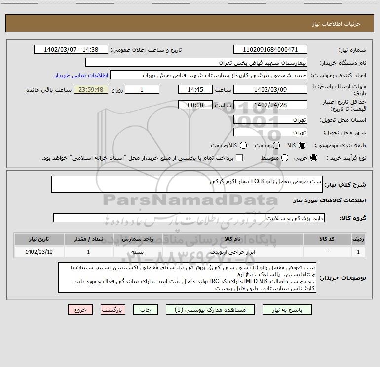 شرح کلی نیاز: ست تعویض مفصل زانو LCCK بیمار اکرم کرکی