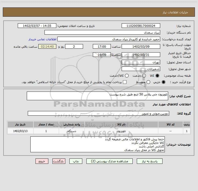 شرح کلی نیاز: تلویزیون جی پلاس 50 اینچ طبق شرح پیوست