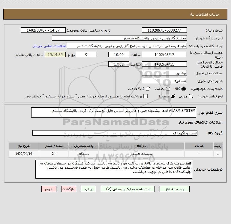 شرح کلی نیاز: ALARM SYSTEM لطفا پیشنهاد فنی و مالی بر اساس فایل پیوست ارائه گردد. پالایشگاه ششم