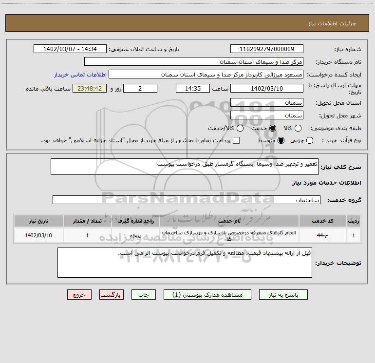 شرح کلی نیاز: تعمیر و تجهیز صدا وسیما ایستگاه گرمسار طبق درخواست پیوست
