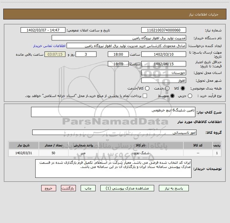 شرح کلی نیاز: تامین شلینگ6 اینچ خرطومی