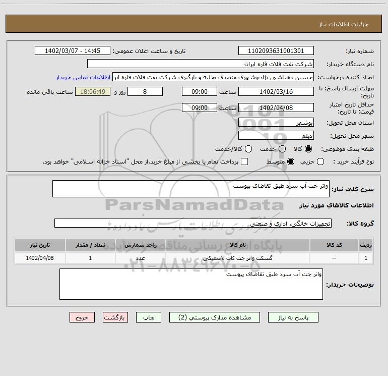 شرح کلی نیاز: واتر جت آب سرد طبق تقاضای پیوست