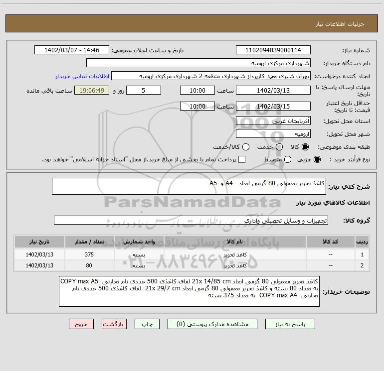 شرح کلی نیاز: کاغذ تحریر معمولی 80 گرمی ابعاد A4 و A5