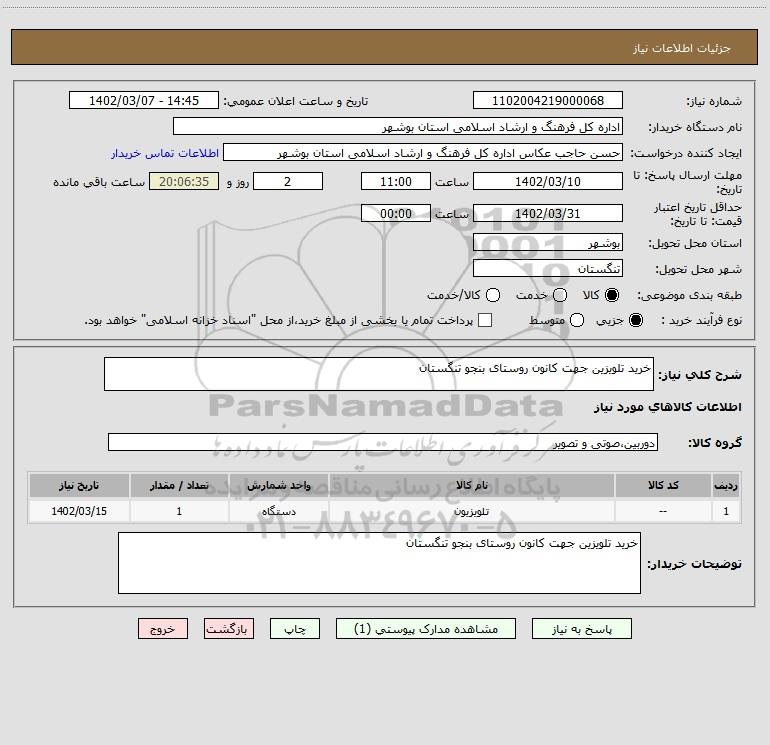 شرح کلی نیاز: خرید تلویزین جهت کانون روستای بنجو تنگستان