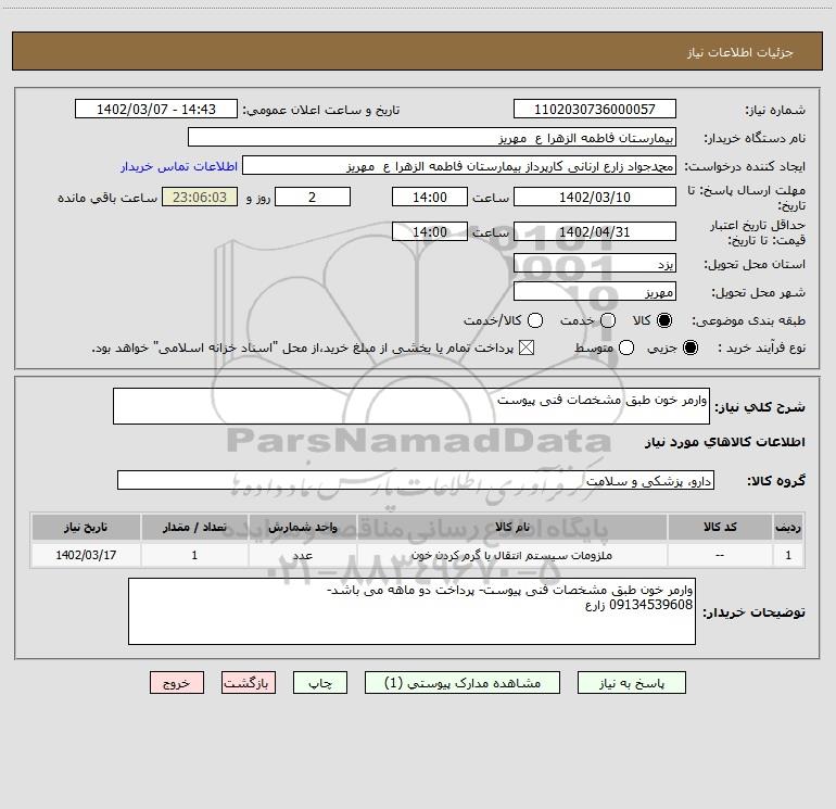 شرح کلی نیاز: وارمر خون طبق مشخصات فنی پیوست