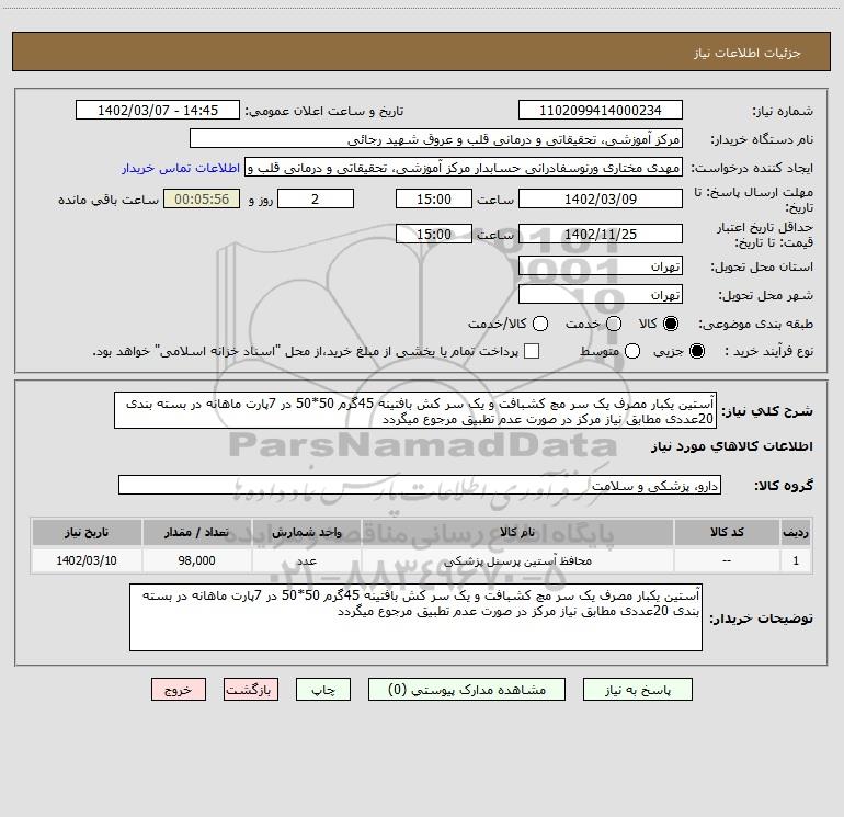 استعلام آستین یکبار مصرف یک سر مچ کشبافت و یک سر کش بافتینه 45گرم 50*50 در 7پارت ماهانه در بسته بندی 20عددی مطابق نیاز مرکز در صورت عدم تطبیق مرجوع میگردد, استعلام آستین یکبار مصرف یک سر مچ کشبافت و یک سر کش بافتینه 45گرم 50*50 در 7پارت ماهانه در بسته بندی 20عددی مطابق نیاز مرکز در صورت عدم تطبیق مرجوع میگردد