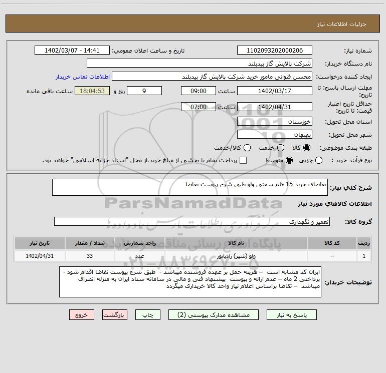 شرح کلی نیاز: تقاضای خرید 15 قلم سفتی ولو طبق شرح پیوست تقاضا