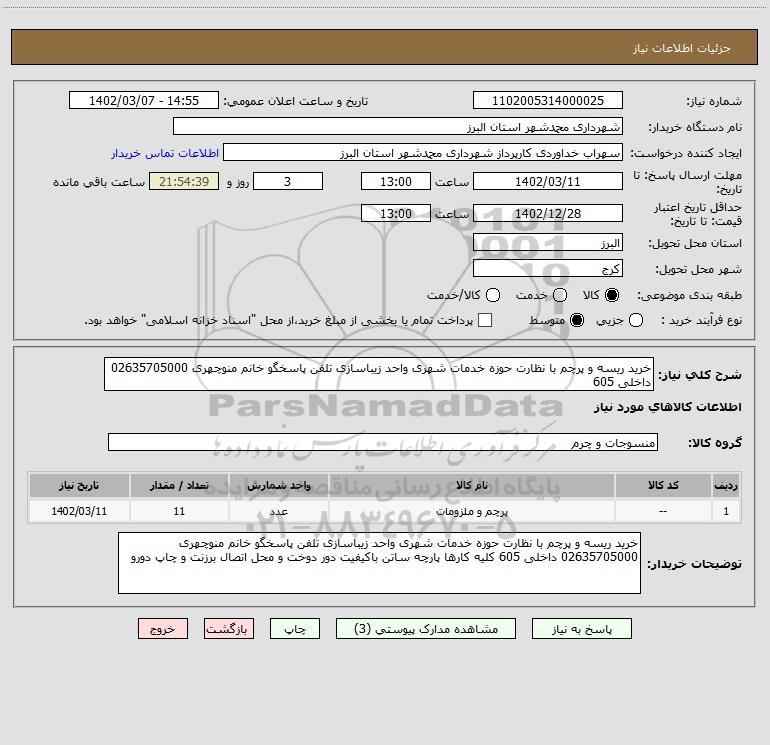 شرح کلی نیاز: خرید ریسه و پرچم با نظارت حوزه خدمات شهری واحد زیباسازی تلفن پاسخگو خانم منوچهری 02635705000 داخلی 605