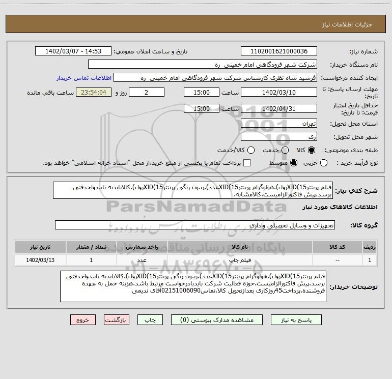 استعلام فیلم پرینترXID(15رول).هولوگرام پرینترXID(15عدد).ریبون رنگی پرینترXID(15رول).کالابایدبه تاییدواحدفنی برسد.پیش فاکتورالزامیست.کالامشابه., استعلام فیلم پرینترXID(15رول).هولوگرام پرینترXID(15عدد).ریبون رنگی پرینترXID(15رول).کالابایدبه تاییدواحدفنی برسد.پیش فاکتورالزامیست.کالامشابه.