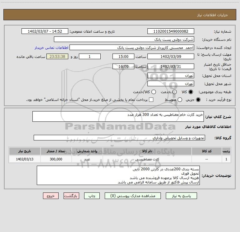 | 1 | -- | کارت مغناطیسی | عدد | 300,000 | 1402/03/13 |