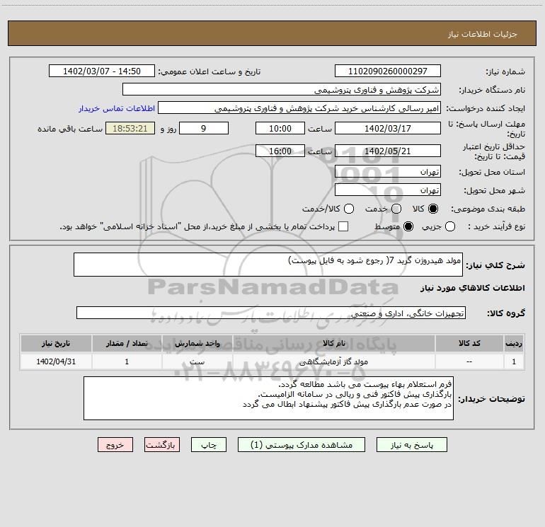 شرح کلی نیاز: مولد هیدروژن گرید 7( رجوع شود به فایل پیوست)