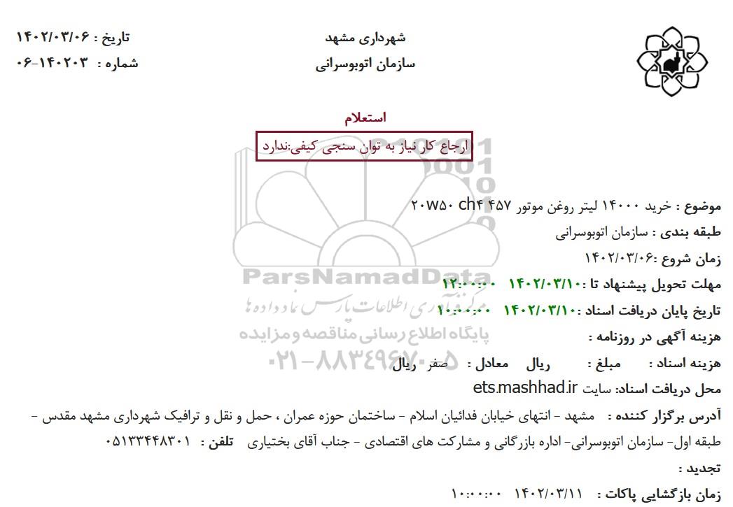 موضوع : خرید 14000 لیتر روغن موتور 457 20w50 ch4