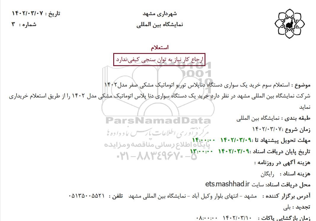شرکت نمایشگاه بین المللی مشهد در نظر دارد خرید یک دستگاه سواری دنا پلاس اتوماتیک مشکی مدل 1402 را از طریق استعلام خریداری نماید