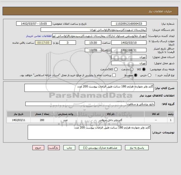 شرح کلی نیاز: گاید وایر چهارده هزارم 180 سانت طبق الزامات پیوست 200 عدد