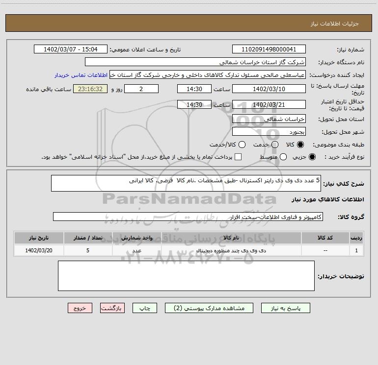 شرح کلی نیاز: 5 عدد دی وی دی رایتر اکسترنال -طبق مشخصات .نام کالا فرضی. کالا ایرانی
