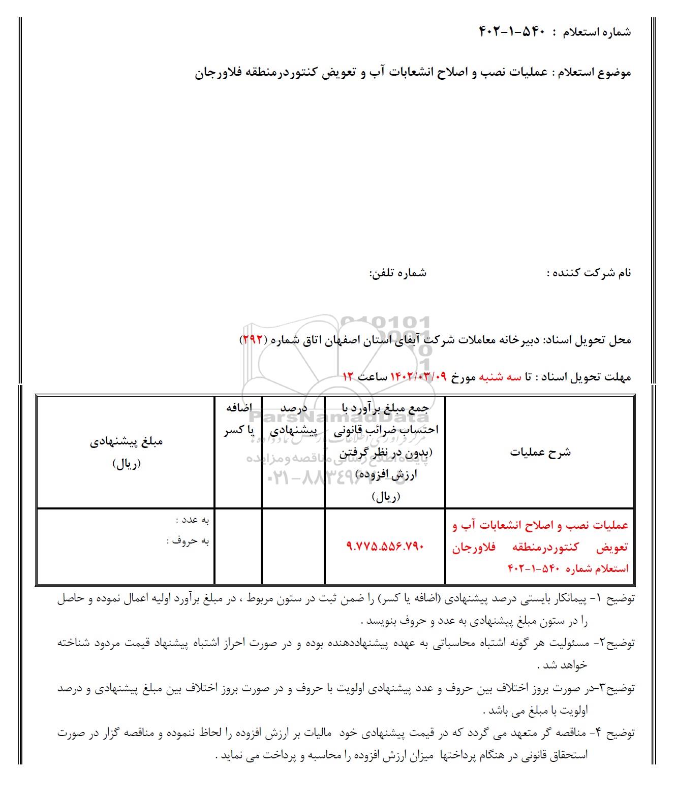 | عملیات نصب و اصلاح انشعابات آب و تعویض کنتور در منطقه فلاورجان استعلام شماره: 540 - 1 - 402 |