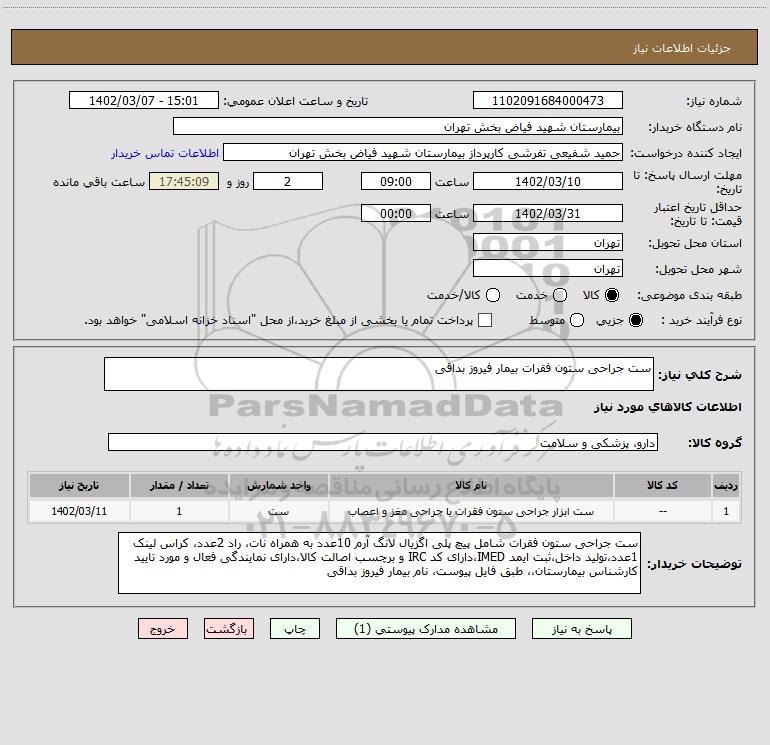 شرح کلی نیاز: ست جراحی ستون فقرات بیمار فیروز بداقی