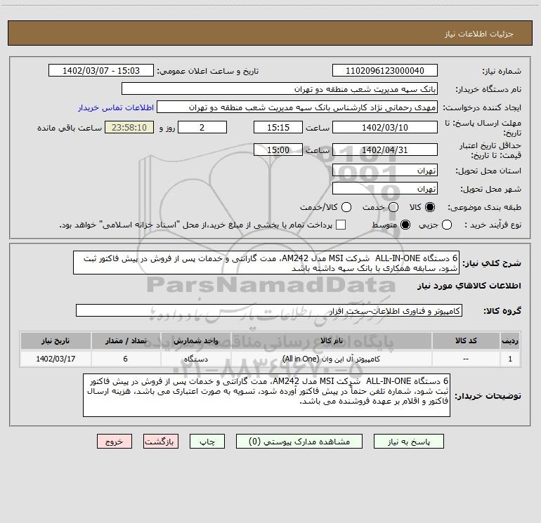 شرح کلی نیاز: 6 دستگاه ALL-IN-ONE شرکت MSI مدل AM242، مدت گارانتی و خدمات پس از فروش در پیش فاکتور ثبت شود، سابقه همکاری با بانک سپه داشته باشد