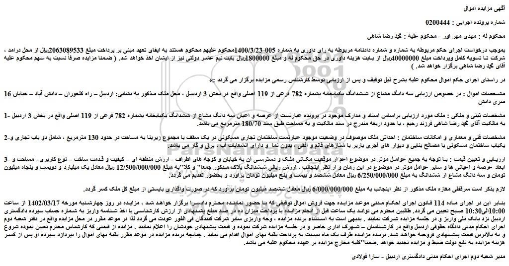 بنابر این در اجرای ماده 114 قانون اجرای احکام مدنی موعد مزایده جهت فروش اموال توقیفی که با حضور نماینده محترم دادسرا برگزار خواهد شد ، مزایده در روز چهارشنبه مورخه 1402/03/17 از ساعت 10:00الی10:30 صبح تعیین می گردد. طالبین محترم می تواند یک ساعت قبل از انجام مزایده با پرداخت میزان ده در صد مبلغ پشنهادی از ارزش کارشناسی با اخذ شناسه واریز به شماره حساب سپرده دادگستری اردبیل نزد بانک ملی واریز و در جلسه مزایده شرکت نمایند . بدیهی است به استثناء برنده مزایده ، وجه واریزی سایر شرکت کنندگان فی الفور عودت می گردد لذا در موعد مقرر در محل مزایده واقع در دفتر شعبه دوم اجرای احکام مدنی دادگاه حقوقی اردبیل واقع در کارشناسان – شهرک اداری حاضر و در جلسه مزایده شرکت نموده و قیمت پیشنهادی خودشان را اعلام نمایند . مزایده از قیمتی که کارشناس محترم تعیین نموده شروع و به بالاترین قیمت پیشنهادی فروخته خواهد شد. برنده مزایده ظرف یک ماه نسبت به پرداخت بقیه بهای اموال اقدام می نماید . چنانچه برنده مزایده در موعد مقرر بقیه بهای اموال را نپردازد سپرده او پس از کسر هزینه مزایده به نفع دولت ضبط و مزایده تجدید خواهد .ضمنا"کلیه مخارج مزایده بر عهده محکوم علیه می باشد
