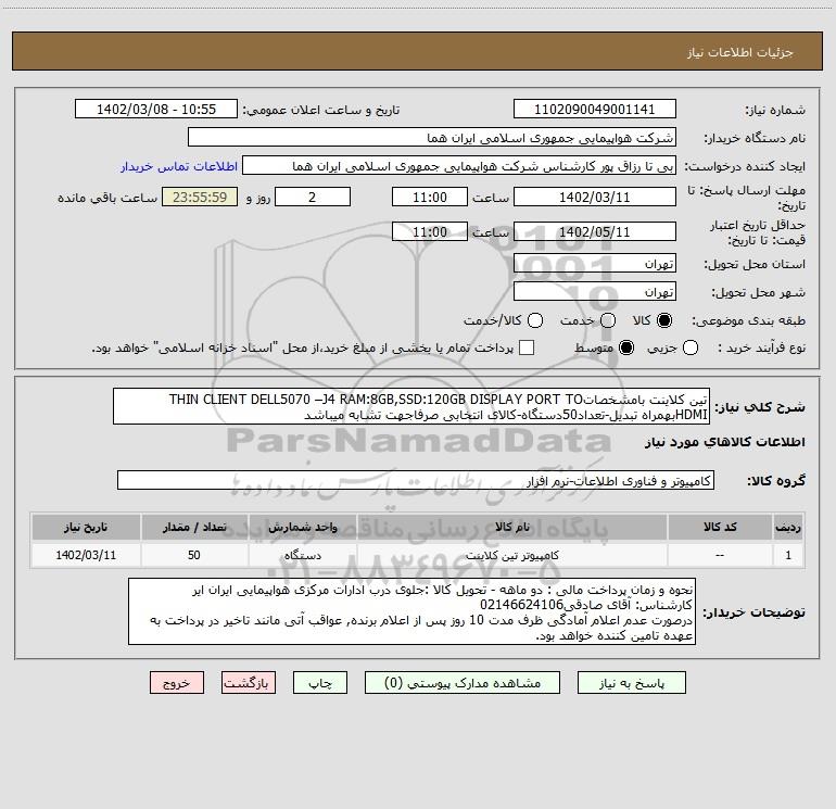 شرح کلی نیاز: تین کلاینت بامشخصاتTHIN CLIENT DELL5070 –J4 RAM:8GB,SSD:120GB DISPLAY PORT TO HDMIبهمراه تبدیل-تعداد50دستگاه-کالای انتخابی صرفاجهت تشابه میباشد