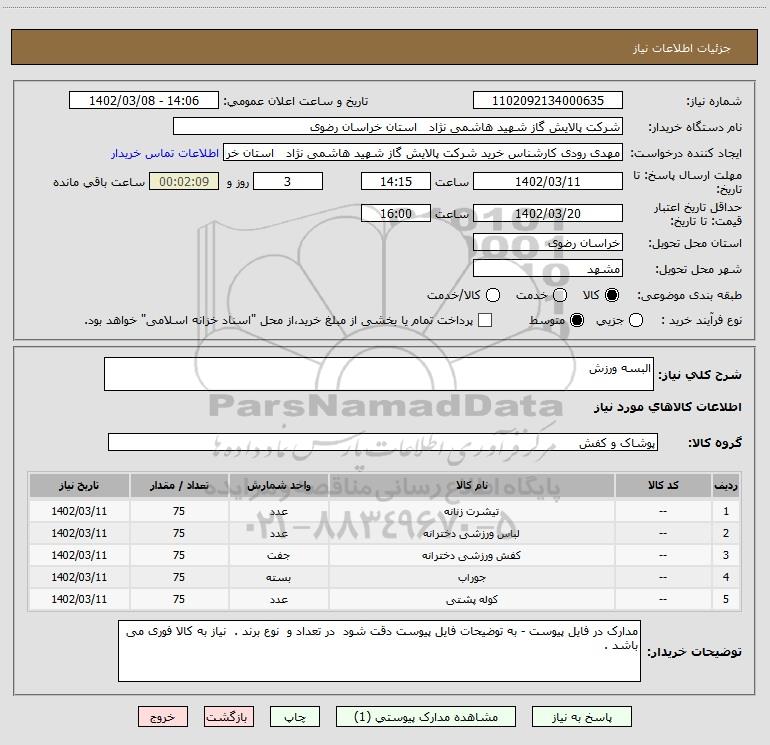 نام دستگاه خریدار:شرکت پالایش گاز شهید هاشمی نژاد استان خراسان رضوی