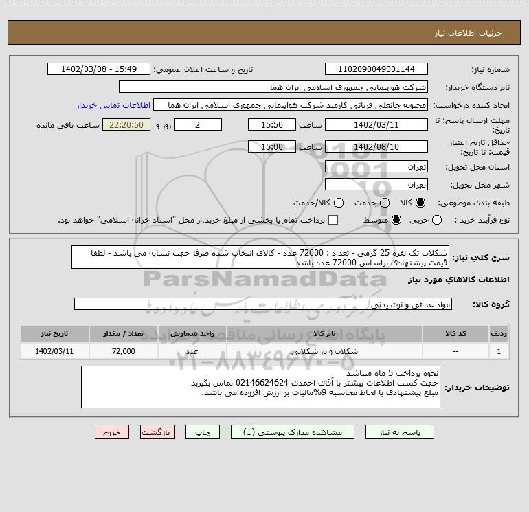 شرح کلی نیاز: شکلات تک نفره 25 گرمی - تعداد : 72000 عدد - کالای انتخاب شده صرفا جهت تشابه می باشد - لطفا قیمت پیشنهادی براساس 72000 عدد باشد