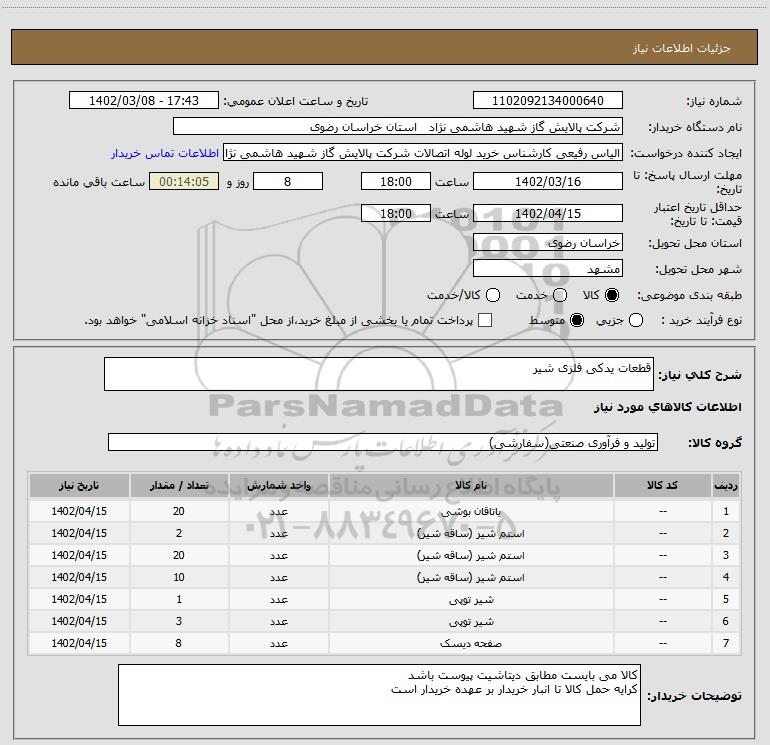 نام دستگاه خریدار:شرکت پالایش گاز شهید هاشمی نژاد استان خراسان رضوی
