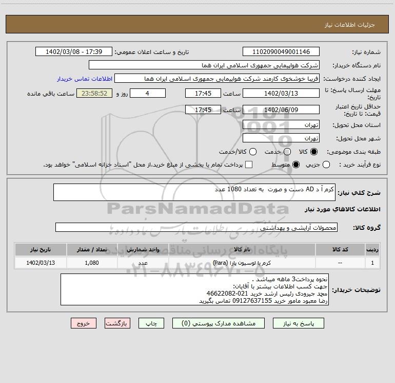 شرح کلی نیاز: کرم آ د AD دست و صورت به تعداد 1080 عدد