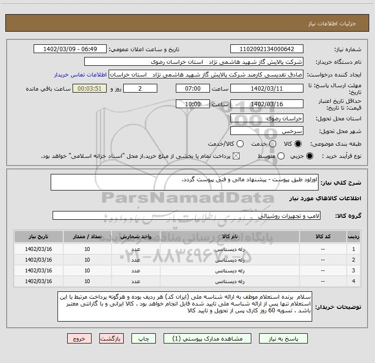 نام دستگاه خریدار:شرکت پالایش گاز شهید هاشمی نژاد استان خراسان رضوی