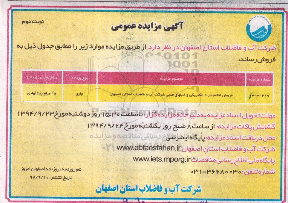 | 299-3-94 | فروش اقلام مازاد الکتریکی و کابلهای مسی شرکت آب و فاضلاب استان اصفهان |