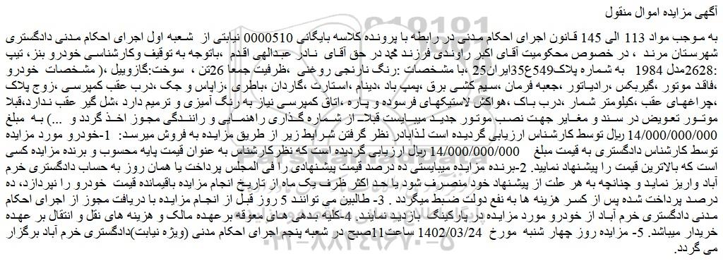 به موجب مواد 113 الی 145 قانون اجرای احکام مدنی در رابطه با پرونده کلاسه بایگانی 0000510 نیابتی از شعبه اول اجرای احکام مدنی دادگستری شهرستان مرند ، در خصوص محکومیت آقای اکبر راوندی فرزند محمد در حق آقای نادر عبدالهی اقدم ،باتوجه به توقیف وکارشناسی خودرو بنز، تیپ :2628مدل 1984 به شماره پلاک549ع35ایران25 ،با مشخصات :رنگ نارنجی روغنی ،ظرفیت جمعا 26تن ، سوخت:گازوییل ،( مشخصات خودرو ،فاقد موتور ،گیربکس ،رادیاتور ،جعبه فرمان ،سیم کشی برق ،پمپ باد ،دینام ،استارت ،گاردان ،باطری ،زاپاس و جک ،درب عقب کمپرسی ،زوج پلاک ،چراغهای عقب ،کیلومتر شمار ،درب باک ،هواکش لاستیکهای فرسوده و پاره ،اتاق کمپرسی نیاز به رنگ آمیزی و ترمیم دارد ،شل گیر عقب ندارد،قبلا موتور تعویض در سند و مغایر جهت نصب موتور جدید میبایست قبلا از شماره گذاری راهنمایی و رانندگی مجوز اخذ گردد و ...) به مبلغ 14/000/000/000 ریال توسط کارشناس ارزیابی گردیده است لذابادر نظر گرفتن شرایط زیر از طریق مزایده به فروش میرسد: 1-خودرو مورد مزایده توسط کارشناس دادگستری به قیمت مبلغ 14/000/000/000 ریال ارزیابی گردیده است که نظرکارشناس به عنوان قیمت پایه محسوب و برنده مزایده کسی است که بالاترین قیمت را پیشنهاد نمایید. 2-برنده مزایده میبایستی ده درصد قیمت پیشنهادی را فی المجلس پرداخت یا همان روز به حساب دادگستری خرم آباد واریز نماید و چنانچه به هر علت از پیشنهاد خود منصرف شود یا حد اکثر ظرف یک ماه از تاریخ انجام مزایده باقیمانده قیمت خودرو را نپردازد، ده درصد پرداخت شده پس از کسر هزینه ها به نفع دولت ضبط میگردد . 3- طالبین می توانند 5 روز قبل از انجام مزایده با دریافت مجوز از اجرای احکام مدنی دادگستری خرم آباد از خودرو مورد مزایده در پارکینگ بازدید نمایند. 4-کلیه بدهی های معوقه برعهده مالک و هزینه های نقل و انتقال بر عهده خریدار میباشد. 5- مزایده روز چهار شنبه مورخ 1402/03/24 ساعت11صبح در شعبه پنجم اجرای احکام مدنی (ویژه نیابت)دادگستری خرم آباد برگزار می گردد.