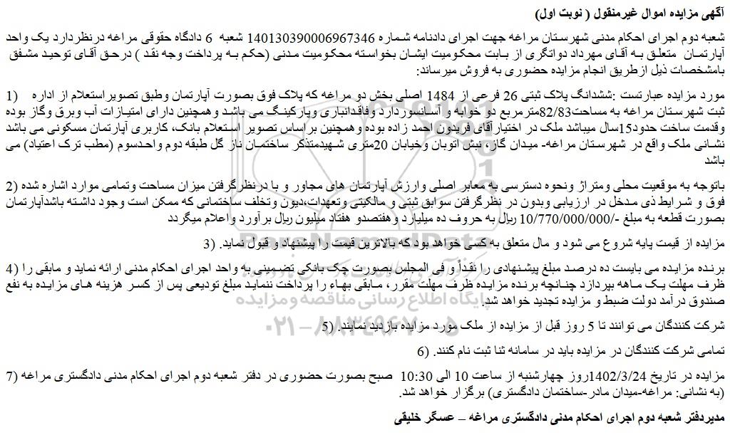 7) مزایده در تاریخ 1402/3/24روز چهارشنبه از ساعت 10 الی 10:30 صبح بصورت حضوری در دفتر شعبه دوم اجرای احکام مدنی دادگستری مراغه (به نشانی: مراغه-میدان مادر-ساختمان دادگستری) برگزار خواهد شد.