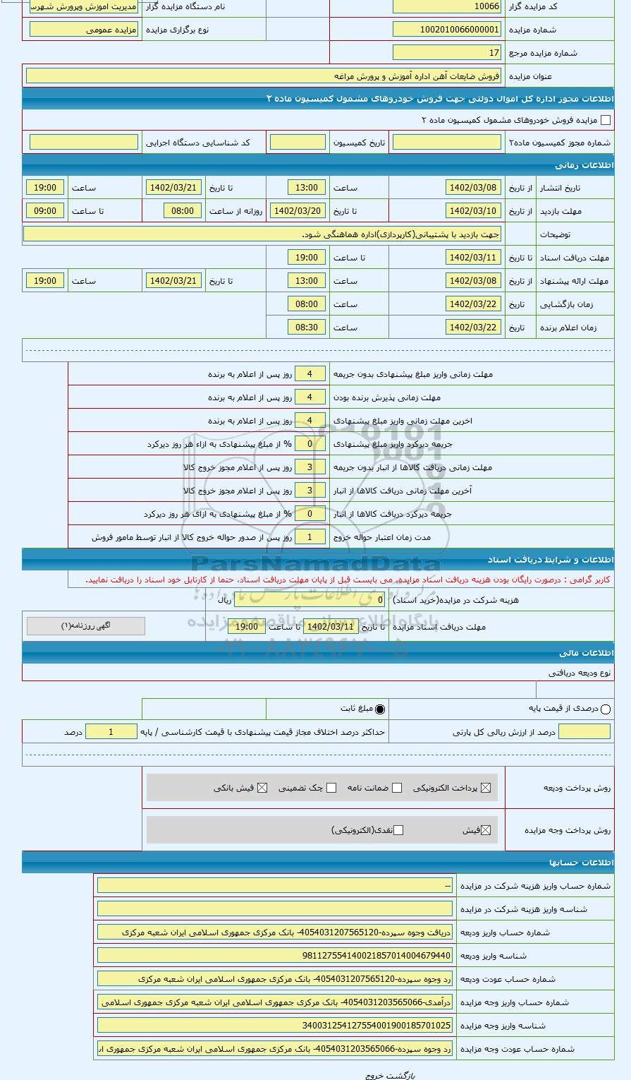 | کد مزایده گزار | 10066 | نام دستگاه مزایده گزار | مدیریت اموزش وپرورش شهرستان مراغه | |