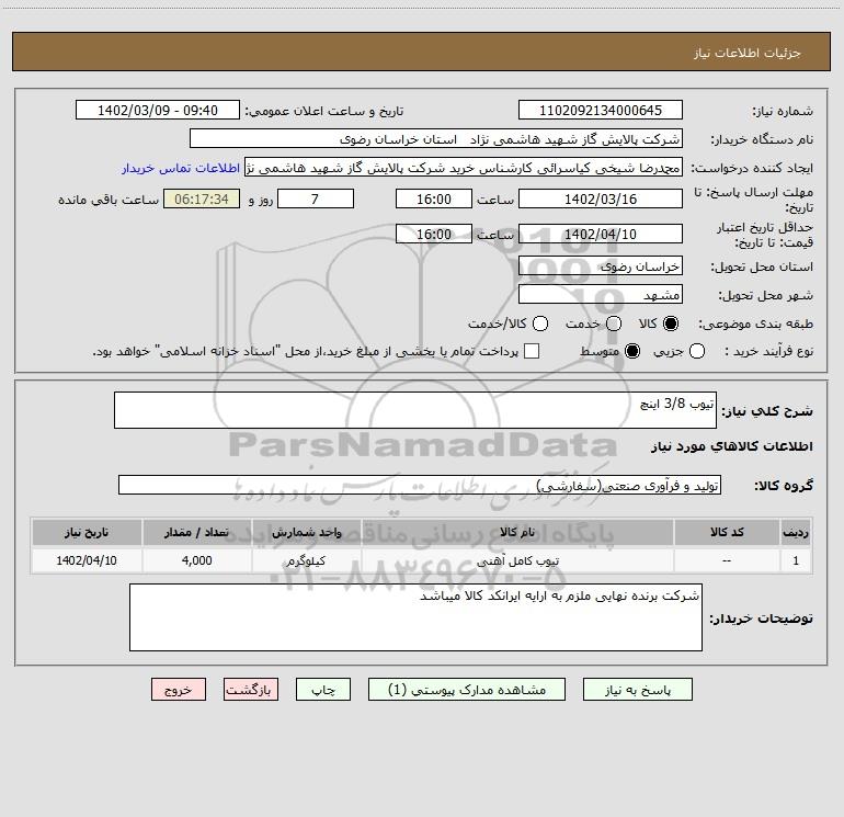 نام دستگاه خریدار:شرکت پالایش گاز شهید هاشمی نژاد استان خراسان رضوی