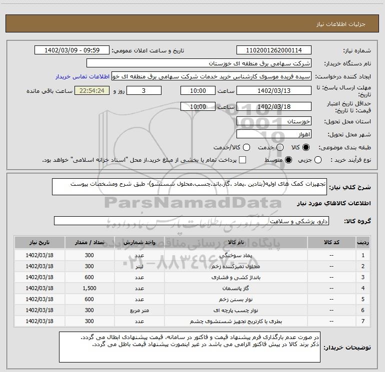 استعلام تجهیزات کمک های اولیه(بتادین .پماد .گاز.باند.چسب.محلول شستشو)- طبق شرح ومشخصات پیوست, استعلام تجهیزات کمک های اولیه(بتادین .پماد .گاز.باند.چسب.محلول شستشو)- طبق شرح ومشخصات پیوست