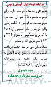 شهرداری قدمگاه در نظر دارد برابر مصوبه شماره 35 شورای اسلامی شهر نسبت به فروش 2 قطعه زمین واقع در بلوار امام خمینی ره 68 با کاربری مسکونی با متراژ 244- 243 متر مربع اقدام نماید.