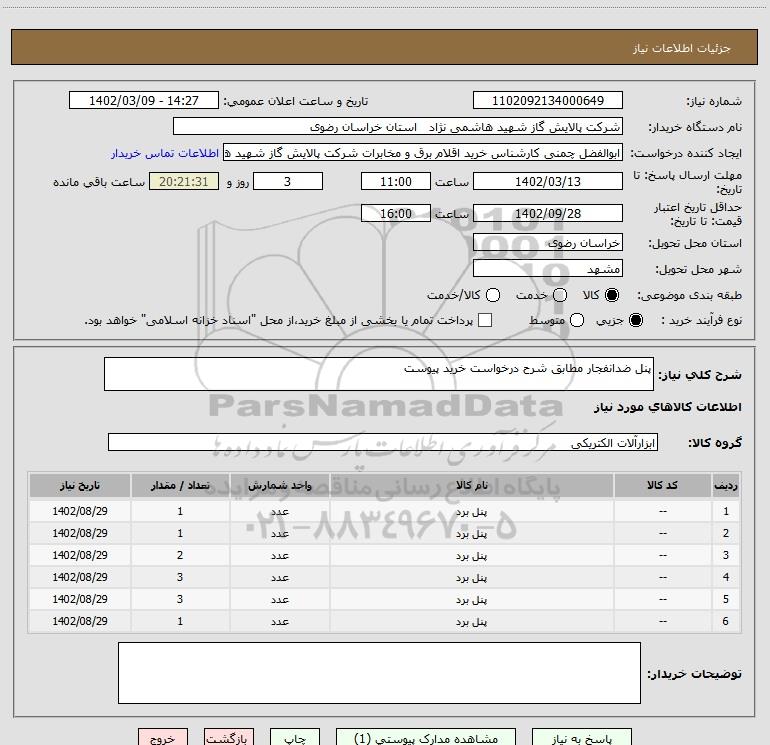 استعلام پنل ضدانفجار مطابق شرح درخواست خرید پیوست, استعلام پنل ضدانفجار مطابق شرح درخواست خرید پیوست
