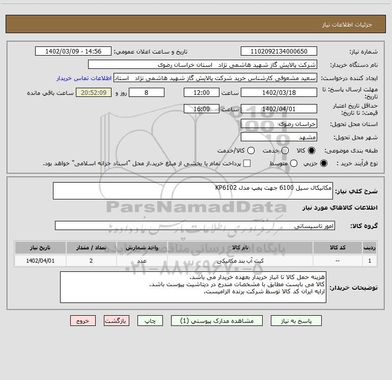 شرح کلی نیاز: مکانیکال سیل 6100 جهت پمپ مدل KP6102