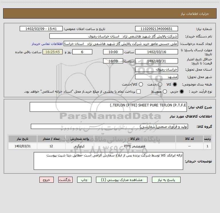نام دستگاه خریدار:شرکت پالایش گاز شهید هاشمی نژاد استان خراسان رضوی