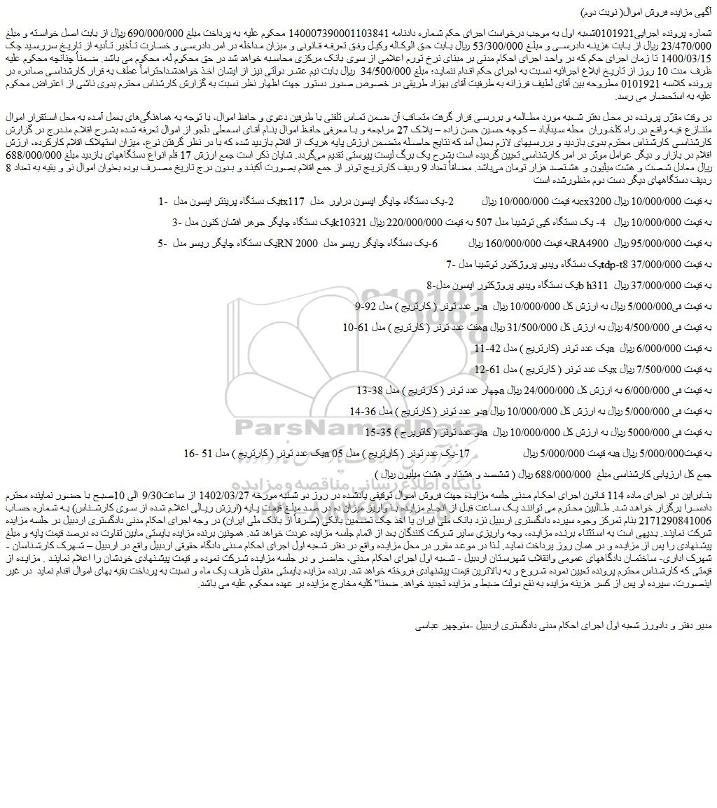 بنابراین در اجرای ماده 114 قانون اجرای احکام مدنی جلسه مزایده جهت فروش اموال توقیفی یادشده در روز دو شنبه مورخه 1402/03/27 از ساعت9/30 الی 10صبح با حضور نماینده محترم دادسرا برگزار خواهد شد. طالبین محترم می توانند یک ساعت قبل از انجام مزایده با واریز میزان ده در صد مبلغ قیمت پایه (ارزش ریالی اعلام شده از سوی کارشناس) به شماره حساب 2171290841006 بنام تمرکز وجوه سپرده دادگستری اردبیل نزد بانک ملی ایران یا اخذ چک تضمین بانکی (صرفاً از بانک ملی ایران) در وجه اجرای احکام مدنی دادگستری اردبیل در جلسه مزایده شرکت نمایند. بدیهی است به استثناء برنده مزایده، وجه واریزی سایر شرکت کنندگان بعد از اتمام جلسه مزایده عودت خواهد شد. همچنین برنده مزایده بایستی مابین تفاوت ده درصد قیمت پایه و مبلغ پیشنهادی را پس از مزایده و در همان روز پرداخت نماید. لذا در موعد مقرر در محل مزایده واقع در دفتر شعبه اول اجرای احکام مدنی دادگاه حقوقی اردبیل واقع در اردبیل – شهرک کارشناسان - شهرک اداری- ساختمان دادگاههای عمومی وانقلاب شهرستان اردبیل - شعبه اول اجرای احکام مدنی، حاضر و در جلسه مزایده شرکت نموده و قیمت پیشنهادی خودشان را اعلام نمایند . مزایده از قیمتی که کارشناس محترم پرونده تعیین نموده شروع و به بالاترین قیمت پیشنهادی فروخته خواهد شد. برنده مزایده بایستی منقول ظرف یک ماه و نسبت به پرداخت بقیه بهای اموال اقدام نماید در غیر اینصورت، سپرده او پس از کسر هزینه مزایده به نفع دولت ضبط و مزایده تجدید خواهد. ضمنا" کلیه مخارج مزایده بر عهده محکوم علیه می باشد.