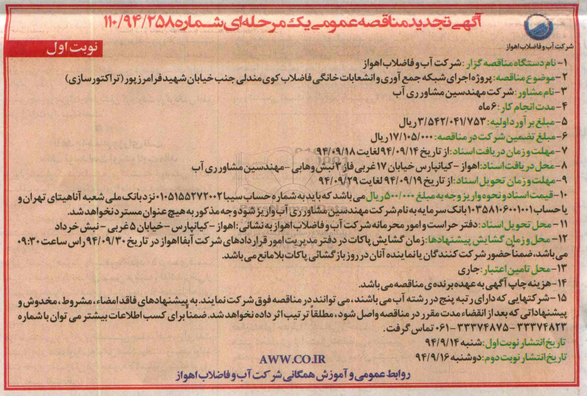 1- نام دستگاه مناقصه گزار: شرکت آب و فاضلاب اهواز