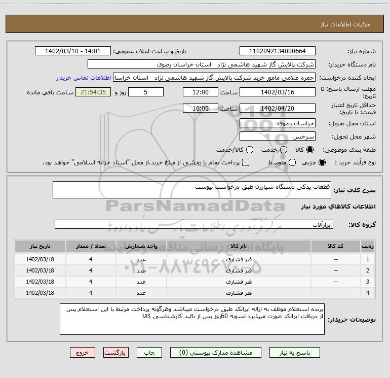 نام دستگاه خریدار:شرکت پالایش گاز شهید هاشمی نژاد استان خراسان رضوی